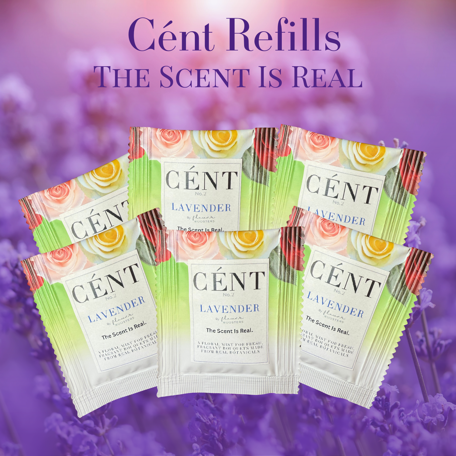 Includes three Cént™ lavender powder refill packets to use with your existing bottle. Made from the actual flowers—not synthetic fragrance—Cént™ is a flower spray that brings back the natural lavender aroma lost in most commerical flower growing systems.
