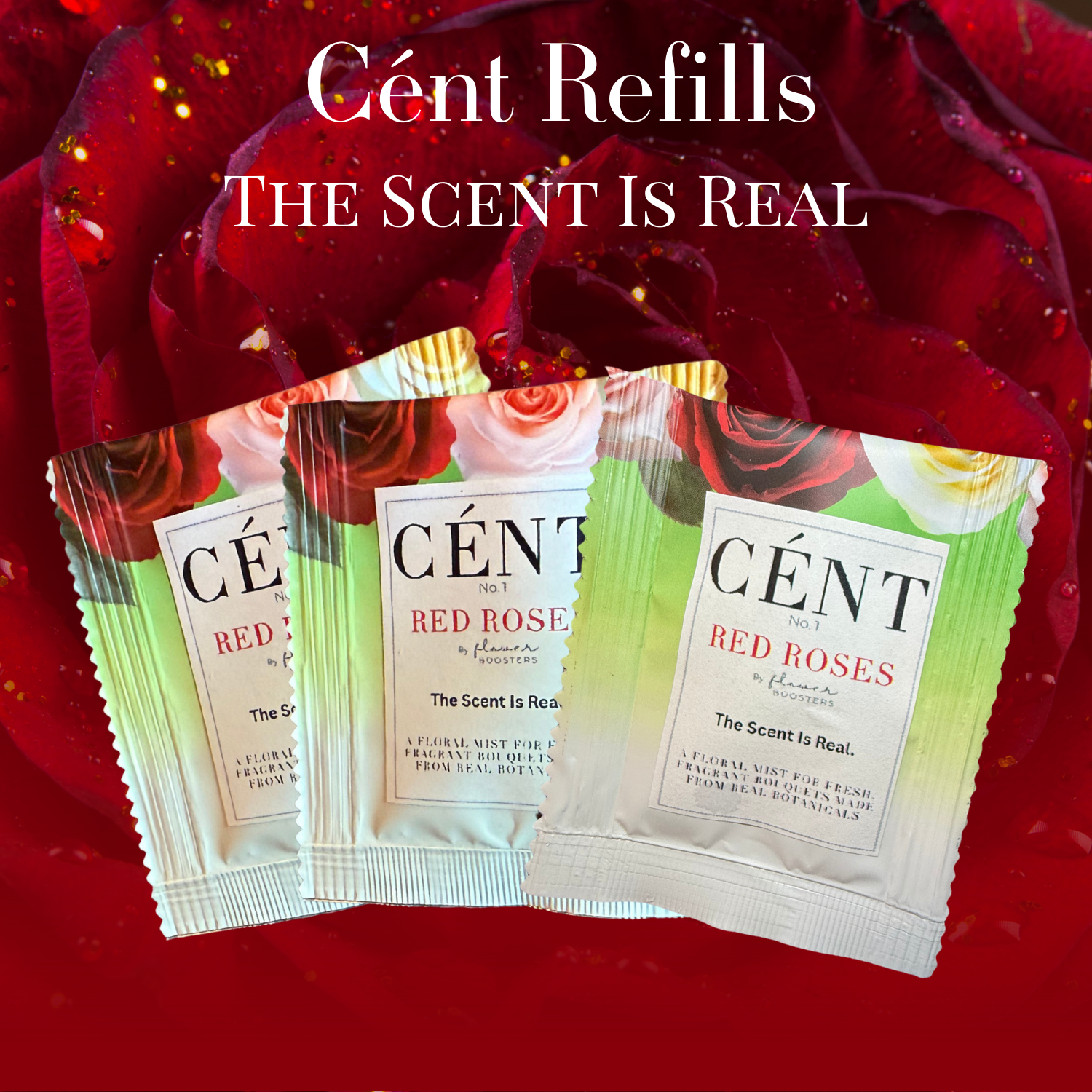 Includes three Cént™ rose powder refill packets to use with your existing bottle. Made from the actual flowers—not synthetic fragrance—Cént™ is a flower spray that brings back the natural rose aroma lost in most commerical flower growing systems.